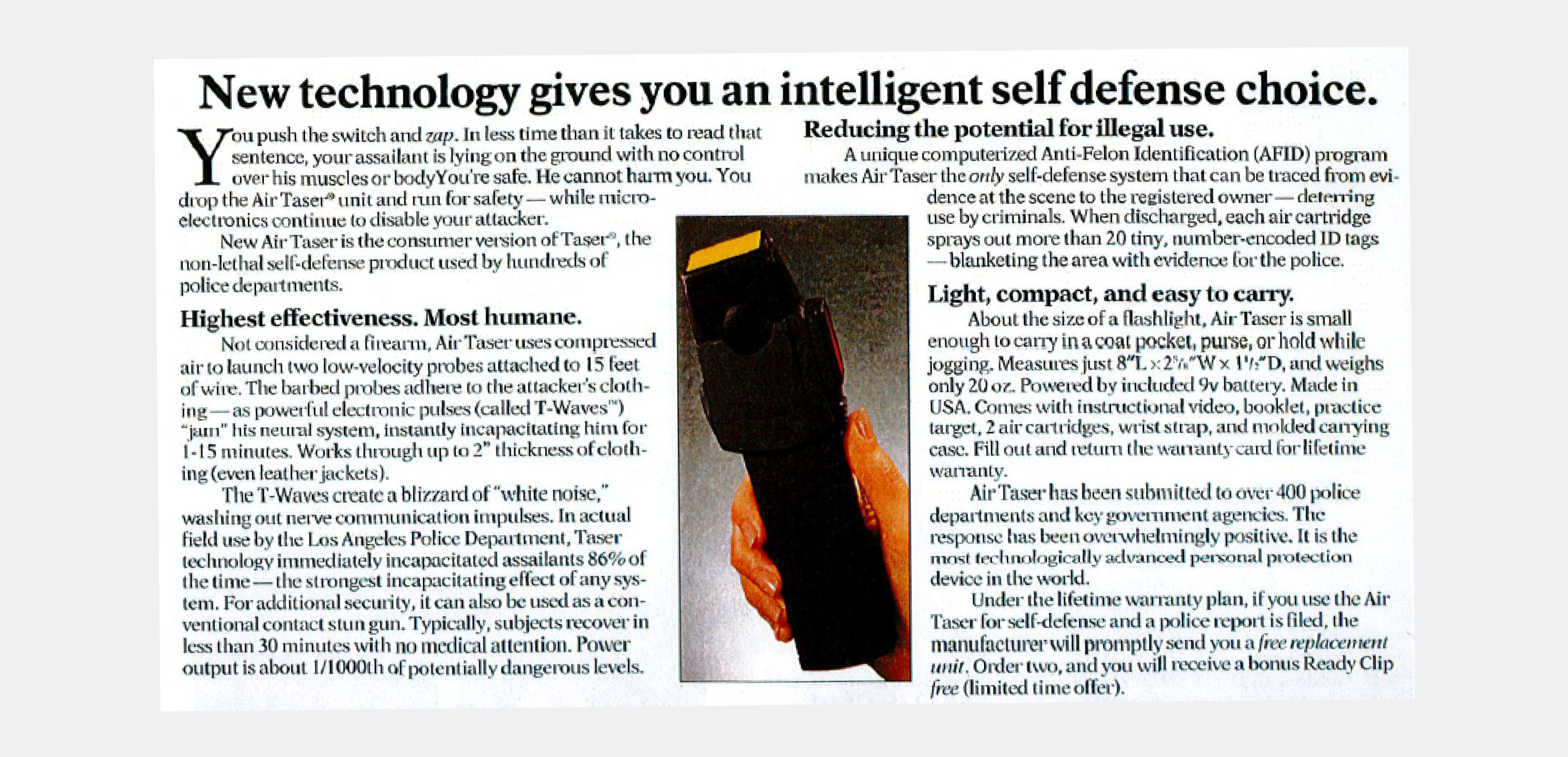 AIR TASER officially released its new redesigned device: the AIR TASER 34000. The AIR TASER 34000 was designed to address several problems that hindered the original TASER device invented by Cover. Importantly, the AIR TASER 34000 was a non-firearm that utilized compressed nitrogen to deploy the projectiles instead of gunpowder. The AIR TASER 34000 was first available to consumers via The Sharper Image, a premier retailer of advanced consumer electronics at the time.
