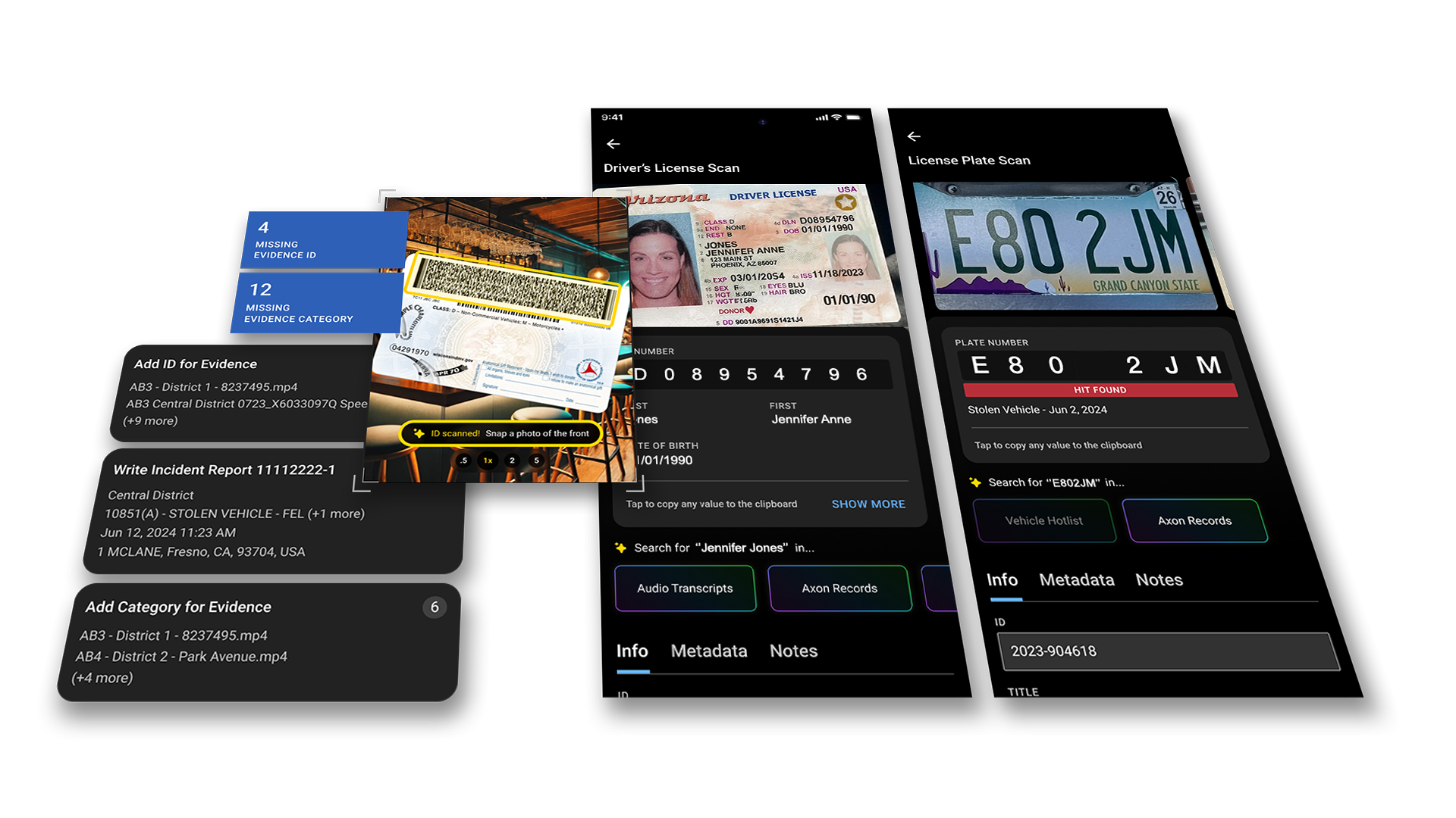 A single scan of a U.S. or Canadian driver’s license instantly extracts structured data that officers can use in the moment and carry forward into reports. As Dan Hecht, Senior Product Manager at Axon, explains: “We wanted to give officers something they could rely on in the moment — a simple action that unlocks multiple downstream benefits without slowing them down.”