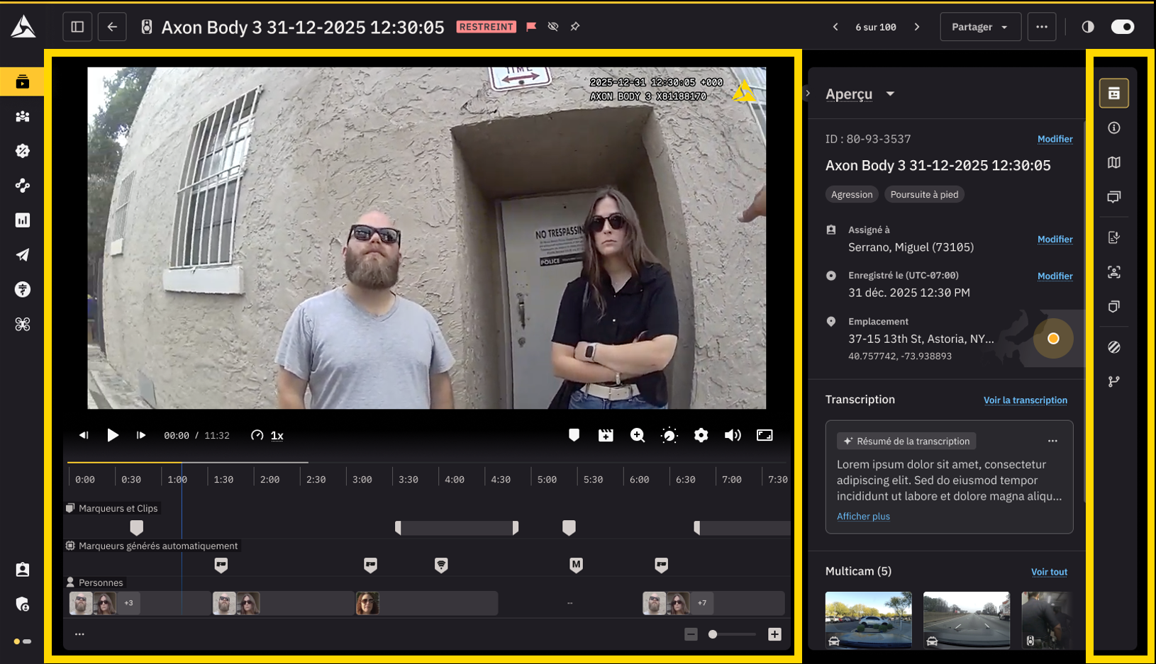 6. Volet d’assistance – Tous les éléments essentiels, tels que les métadonnées, les notes, les transcriptions, les caviardages, les dossiers, etc., sont soigneusement organisés en onglets pour un accès rapide aux bonnes informations.