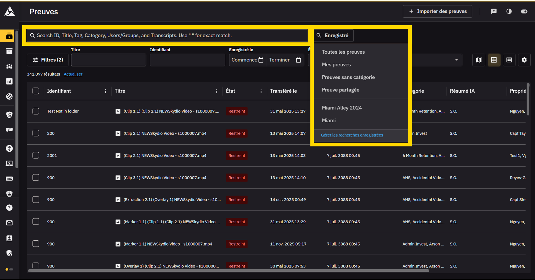 4. Barre de recherche unique – Une recherche unifiée parmi les identifiants, les titres, les étiquettes, les transcriptions, etc., élimine la nécessité de choisir le bon champ et permet d’enregistrer les requêtes fréquentes pour un accès instantané ultérieur.